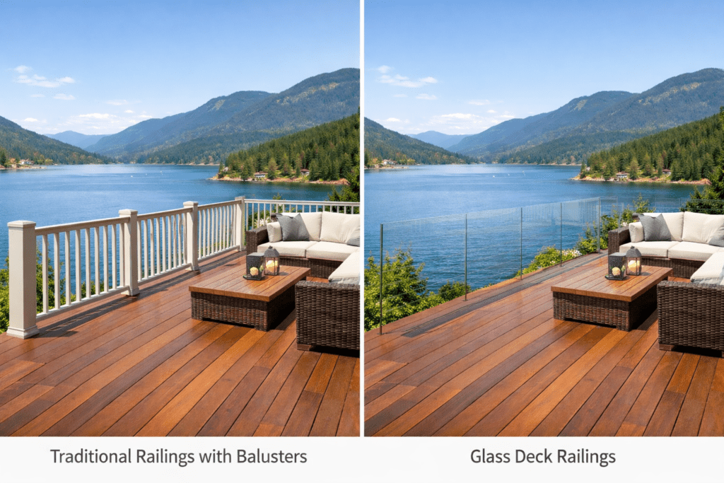 Traditional wood or metal balusters interrupt sight lines. Glass deck railing provides a clean, open look that preserves views while still meeting building code requirements for safety.